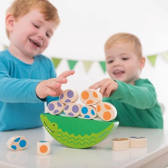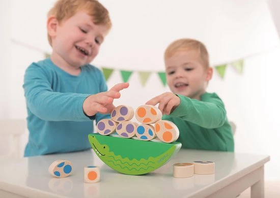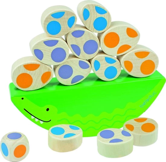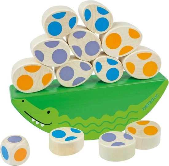 Het Beleduc grappige krokodil spel voor kleine kinderen is een leuk balanceer spel met een krokodil: moeder krokodil beschermt de kleine krokodil eieren. Dit makkelijke spel bevordert vooral de fijne motoriek van de peuter. Een volwassene en een kind kunnen verschillende versi4es spelen met geleidelijk oplopende moeilijkheidsgraden. De kenmerken van dit Beleduc spel zijn zeer verschillend, dus de informatie die de kinderen ontvangen is verschillend: gewicht, vorm en materiaal. Levering bestaat uit 1 moeder krokodil balanceerblok, 4 grote krokodil eieren, 4 kleine krokodil eieren en 1 kleuren dobbelsteen. Het spel is geschikt voor 24 maanden en ouder.