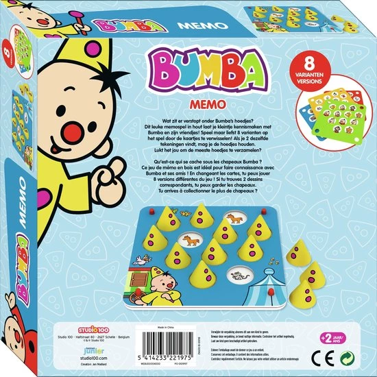 Wat zit er verstopt onder Bumba’s hoedjes? Dit leuke memospel in hout laat je kleintje kennismaken met Bumba en zijn vriendjes! Speel maar liefst 8 varianten op het spel door de kaartjes te verwisselen! Als je 2 dezelfde tekeningen vindt, mag je de hoedjes houden. Lukt het jou om de meeste hoedjes te verzamelen?