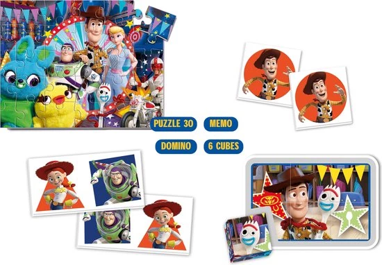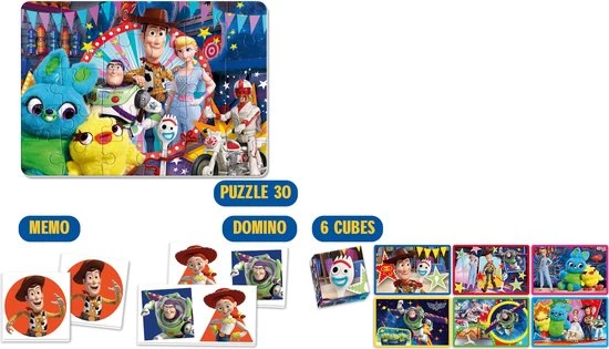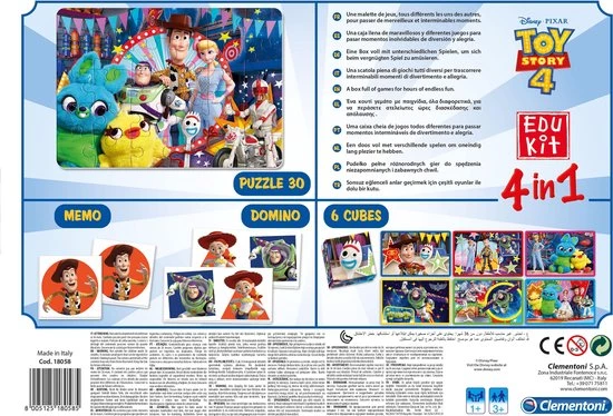 Een uitgebreide 4-in-1 speelset voor het plezier met puzzels, geheugenspelletjes, dominostenen en blokjes naast de fantastische personages van Toy Story 4! De perfecte game voor het ontwikkelen van het geheugen van kinderen, handigheid en observatievaardigheden. Gemaakt in Italië.