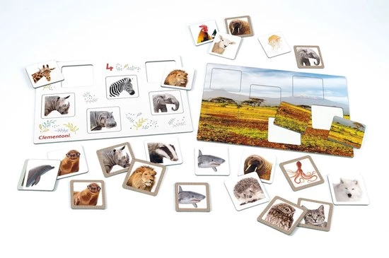 Dit leuke bordspel combineert een klassieke bingo met het ontdekken van het wondere rijk der dieren. De spelkaarten zijn verdeeld in thema’s gebaseerd op de omgeving waarin de dieren leven. Kinderen kunnen hun eigen thema bedenken en personaliseren met hun lievelingsdieren. Stimuleert het observatie- en associatievermogen en stimuleert kinderen om meer te leren over het dierenrijk.