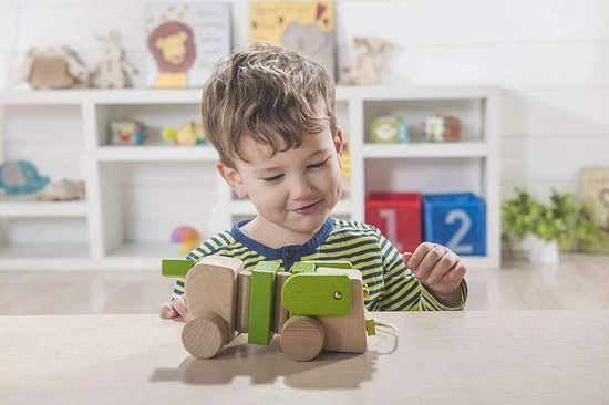 Met deze vrolijke hond van hout kan jouw kind op wandel avontuur!