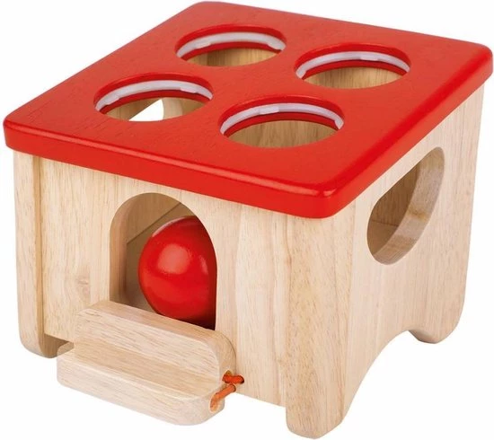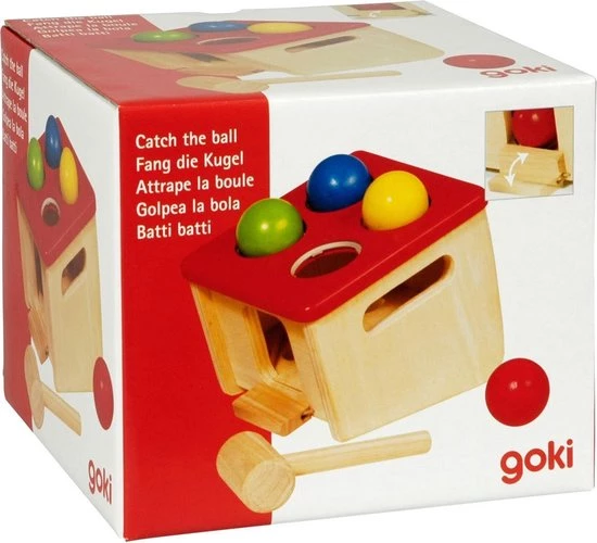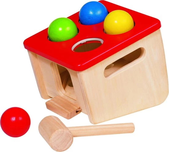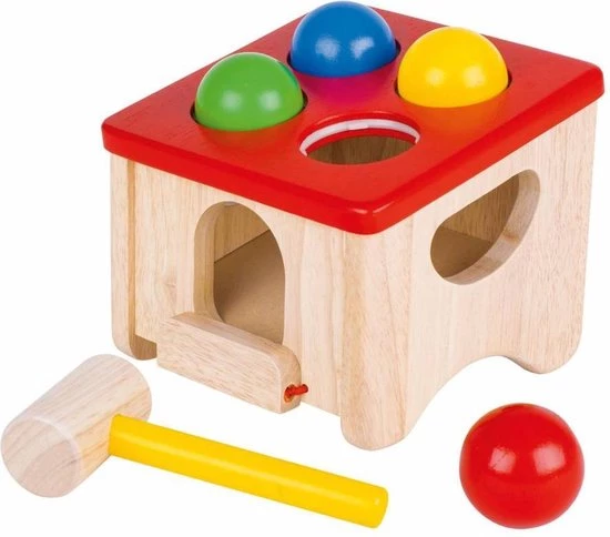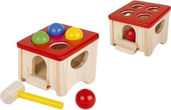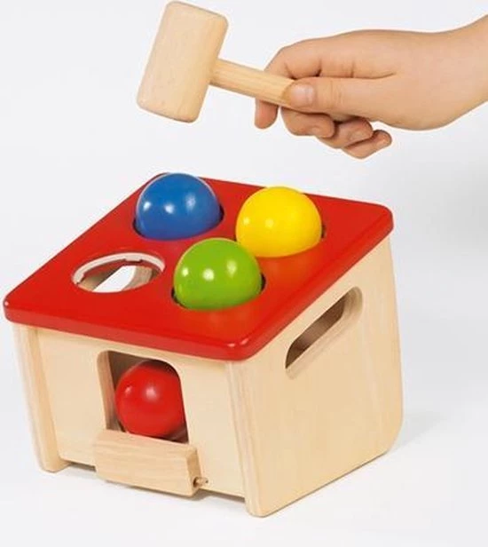 Houten hamerspel in felle kleuren inclusief 4 ballen en hamer. Zet het klepje voor de uitgang open en de ballen rollen weg wanneer ze door het gat heen zijn getimmerd. Probeer ze daarna weer te pakken te krijgen!