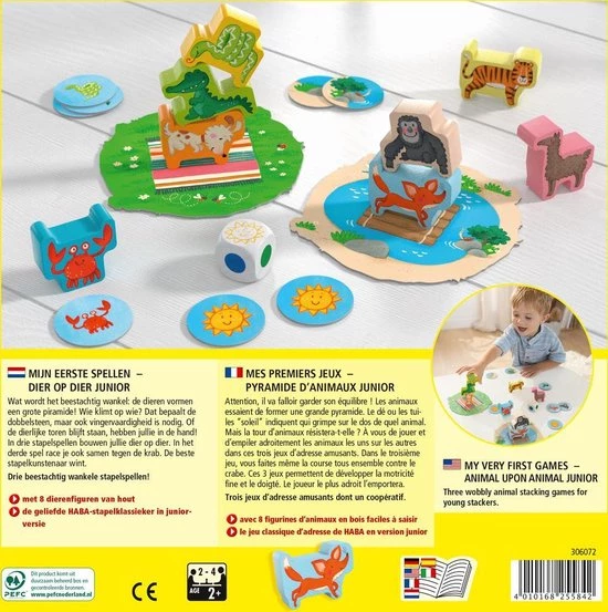 Nu wordt het beestachtig wankel: de dieren vormen een grote piramide! Wie klimt op wie? Dat bepaalt de dobbelsteen, maar ook vingervaardigheid is een vereiste! Of de dierlijke toren blijft staan, dat hebben de spelers in de hand! In drie stapelspellen bouwen ze dier op dier. In het derde spel racen ze ook samen tegen de krab. De beste stapelkunstenaar wint.