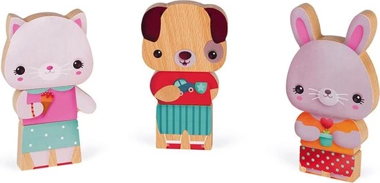 Houten speelgoed. Voor kinderen van 18 tot 36 maanden. 3 dieren in 3 magnetische delen: loshalen, creatief mixen en weer samenvoegen. Een leuk combinatie- en verbeeldingsspel.