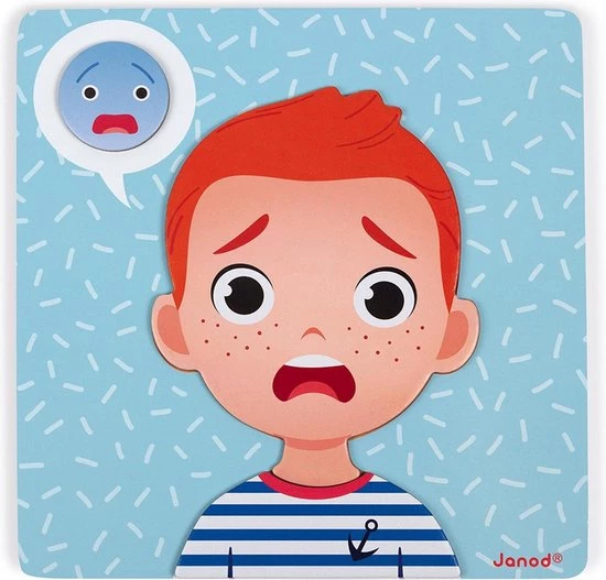 Met een emotiegids opgesteld door ergotherapeuten. Laat uw kinderen met emoties kennismaken door middel van illustratieve kaarten die verschillende situaties in het dagelijks leven voorstellen. Aan de achterkant van elke kaart is er een ‘antwoordgezicht’ die overeenstemt met de te gebruiken magneten om een gezicht met dezelfde emotie te maken. 2 spelniveaus: Maak alleen de uitdrukking die op de achterkant van de kaart is gegeven of probeer te raden welke emotie met elke situatie overeenstemt, voor de grotere kinderen. Er is een tevens een spiegel op de bodem van de doos voorzien zodat het kind verschillende emoties kan uitvoeren en identificeren. 10 te ontdekken emoties: vreugde, angst, verdriet, woede, verlegenheid, liefde, afkeer, lachen, afgunst, verrassing