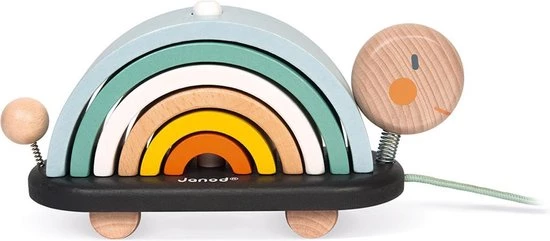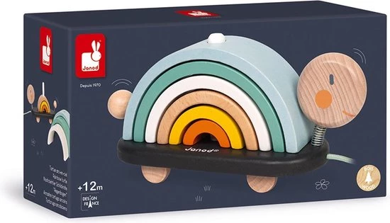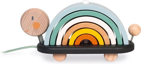 Sweet Cocoon serie: ronde vormen en zachte kleuren. Een leuke schildpad om vooruit te trekken met een regenboogschild van 6 cirkelvormige bogen van hout. De regenboog kan naar wens worden gestapeld om een origineel bouwspel te vormen. In verscheidene zachte kleuren, geïnspireerd op de huidige trends om uw kind in alle rust te laten spelen