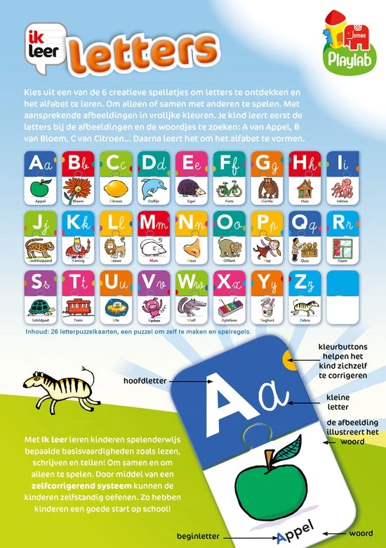 Leer met behulp van de 6 spelletjes de letters van het alfabet. Om alleen of samen mee te spelen. Leg de letters van het alfabet op volgorde van A tot Z. Zie jij een woord dat begint met de letter A? Puzzel dan de juiste afbeelding eraan vast.