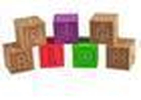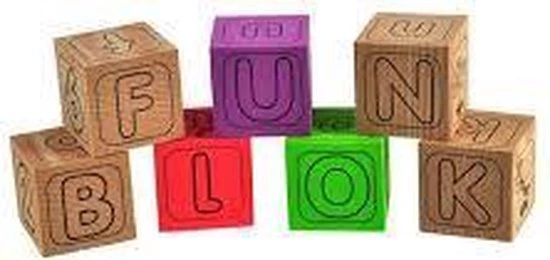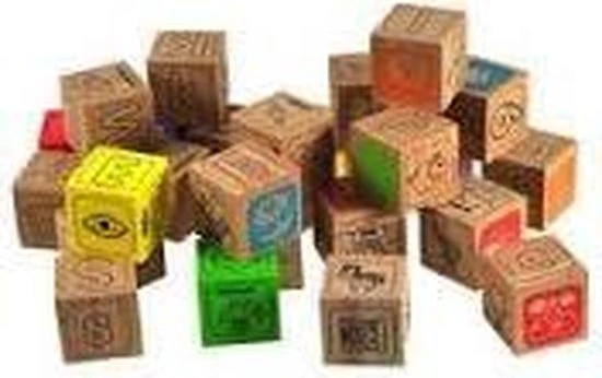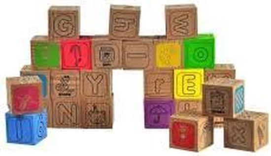Op de blokken staan letters, plaatjes en woordjes ( engelstalig ).