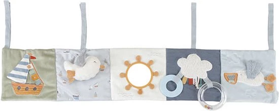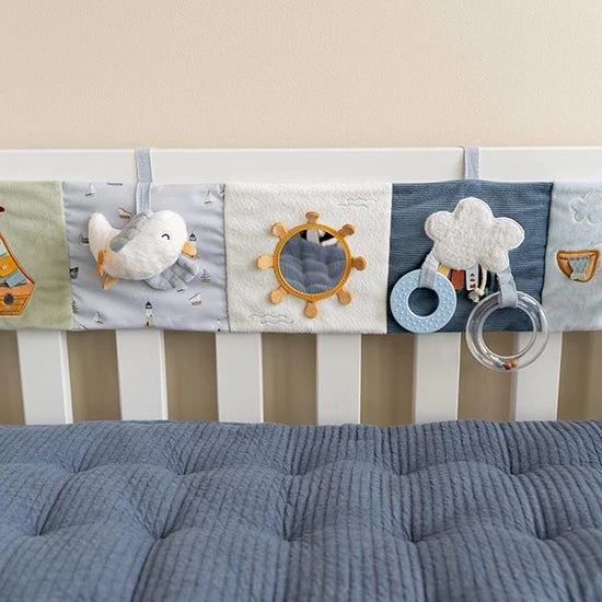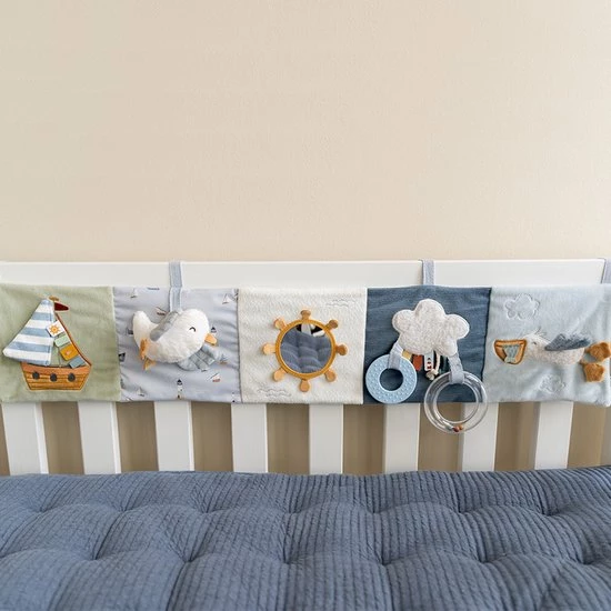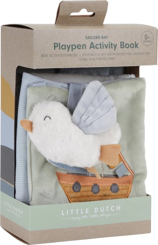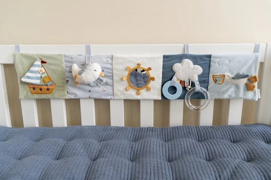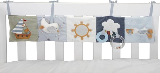 Met dit leuke activiteitenboek in Sailors Bay thema is het speeltijd in de box! Ontdek alle diertjes en babyspeeltjes. Voel de verschillende materialen en verken alle activiteiten. Bekijk jezelf in de spiegel, ontdek de rammelaar en voel de structuur van de bijtring! Dit leuke activiteitenboek zal zeker de zintuigen en de hand-oogcoördinatie van je baby stimuleren. Bevestig de activiteitenhanger eenvoudig aan de box of het ledikant op de juiste positie met behulp van de katoenen touwtjes. Fijn voor je baby om op de focussen in de eerste weken, maar nog leuker om mee te spelen vanaf buikligging.