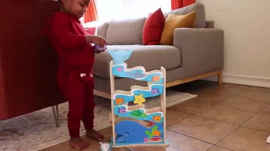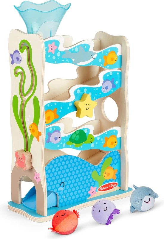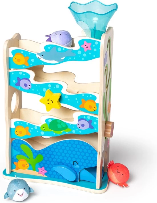 - Bevat een houten glijbaan met geïntegreerd kralendoolhof , een zeester om te draaien en een walvisvin om op te drukken om het rollen te stoppen of starten, een stevige afneembare trechter en 3 Rollables-speelfiguren (haai, krab en octopus met belletjes).