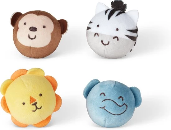 | Verpakkingsinhoud | Bevat, een, gestreepte, zebra, ondeugende, aap, zachtaardige, olifant, en, vriendelijke, leeuw, met, belletjes. |