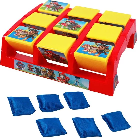 Een actieve variant van ‘Boter Kaas en Eieren! Zet het spelbord op de grond en probeer als eerste 3 dezelfde plaatjes van Paw Patrol op een rij te hebben. Maak het extra moeilijk door de speelzakjes van een afstand in het juiste vakje te gooien.