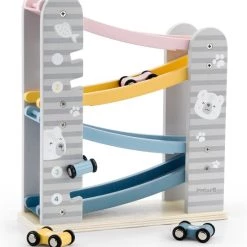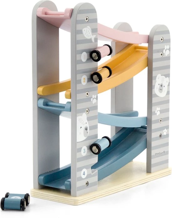 PolarB houten autobaan is een leuke autobaan in zachte kleuren met bijbehorende raceauto’s die helemaal naar beneden gaan als je ze van bovenaf loslaat.
