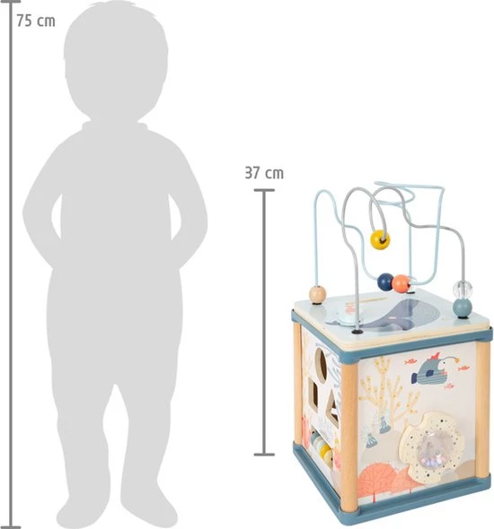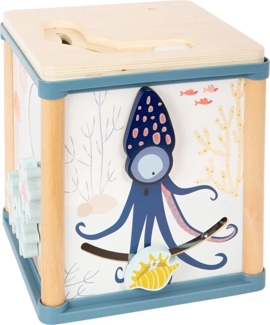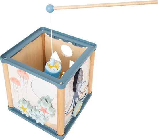 Zoveel te beleven onder water! Deze houten motorische kubus is met zijn motorische lus, vorm-insteekspel, schuiflabyrint, tandwielspel en rammelaar een multitalent met vijf speelbare kanten. Het liefdevol vormgegeven decor met maritieme onderwaterwereld stimuleert het vertellen van verhalen en laat kinderen spelenderwijs de wereld van de zeedieren ontdekken. De octopus, waarvan het hoofd vrolijk wiebelt dankzij een veermechanisme, zorgt voor een extra portie speelplezier. Ook de draaibare patrijspoort met kleurrijke rammelballen en de spiegel zijn bijzondere spelhighlights. Voor de afwisseling is er de bijgeleverde hengel waarmee de drie magnetische insteekmodules kunnen worden opgevist. Dit is erg leuk voor kleine kinderen, traint de motoriek en stimuleert tegelijkertijd het geduld.