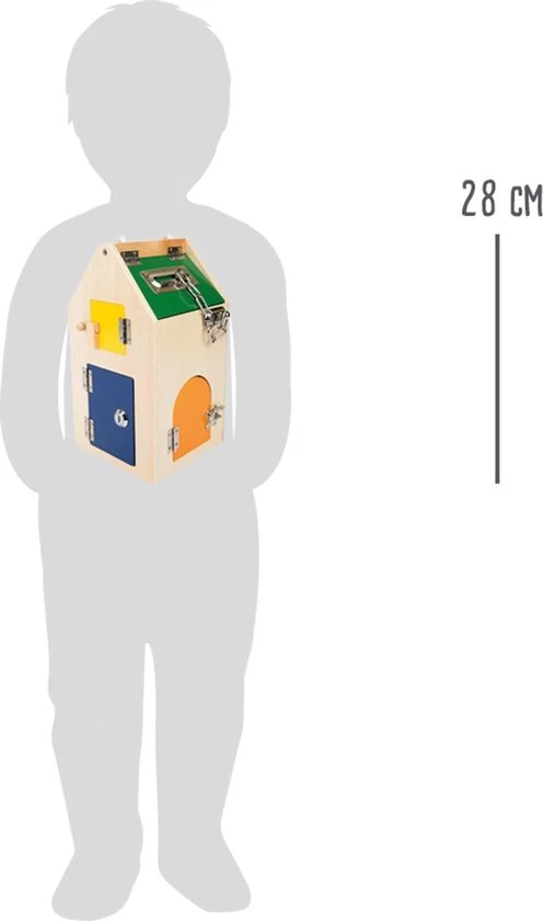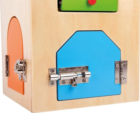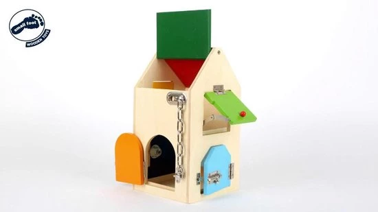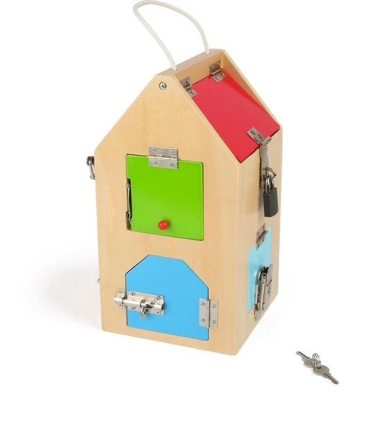 Houten huis met diverse grendels en hendels, veiligheidsketting, beugel- & cilinderslot. Met dit huis worden de alledaagse motorische vaardigheden getraind! Maar wees voorzichtig! – hier worden de lieve kleintjes grote uitbrekers!