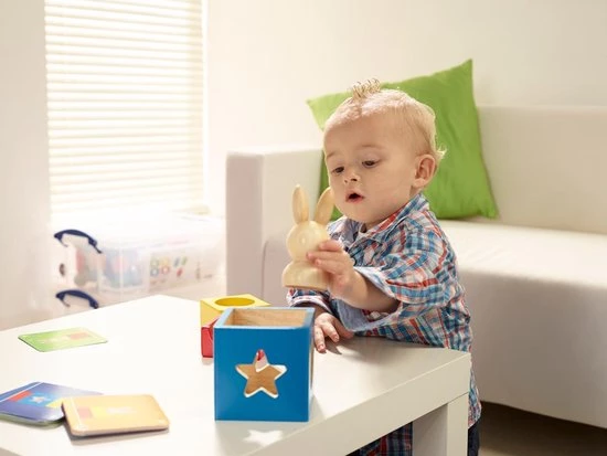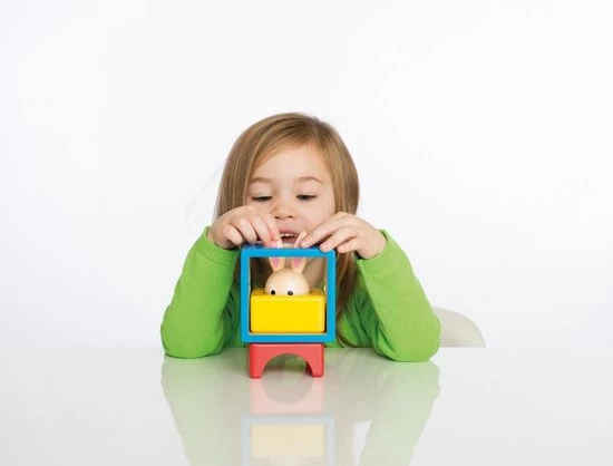 Kijkt het konijn door het ronde gat of door de ster? Zit het konijn op het gele, het rode of het blauwe blokje? Sommige opdrachten zien er bijna hetzelfde uit. Toch kan de oplossing verrassend anders zijn, naargelang hoe ver de oren van het konijn boven de blokken uitsteken.