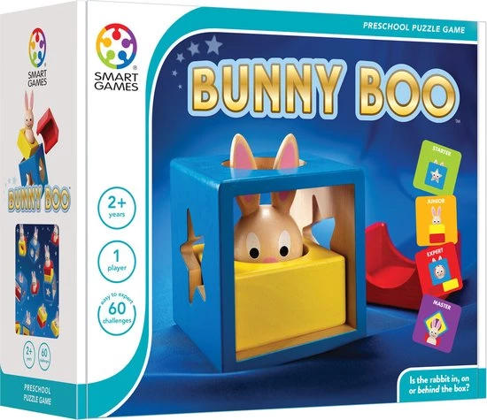 Met Bunny Boo kunnen jonge kinderen de fascinerende wereld van 2D-en 3D-ruimte verkennen. Los de 60 opdrachten op of speel gewoon met de blokken en leer begrippen zoals boven/onder, binnen/buiten, zichtbaar/verborgen. Bunny Boo is een van de eerste spellen die je met een kind kunt spelen.