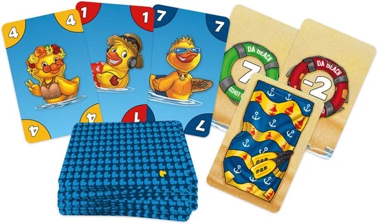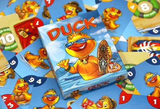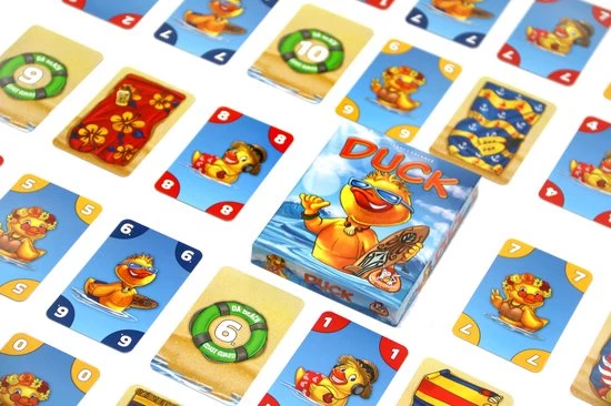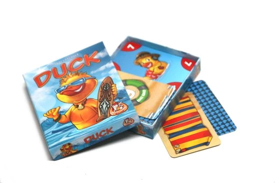 In Duck probeer je handkaarten slim uit te spelen om zo veel mogelijk punten te verzamelen. De speler die als eerste al zijn kaarten kwijtraakt, kan veel punten verdienen. Maar de moedige speler die op het juiste moment wegduikt en de andere spelers verrast, verdient extra punten. Wees je tegenspelers te slim af en probeer in 5 rondes zoveel mogelijk punten onder je strandlaken te leggen. De speler die na de vijfde ronde de meeste punten heeft verdiend, wint het spel.